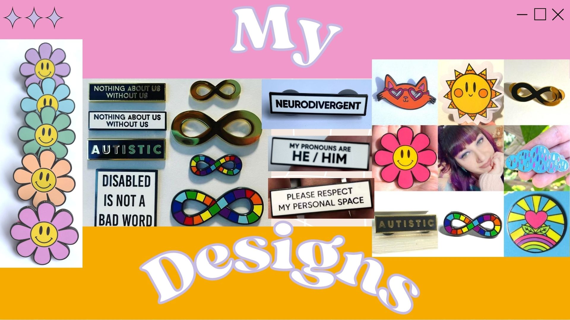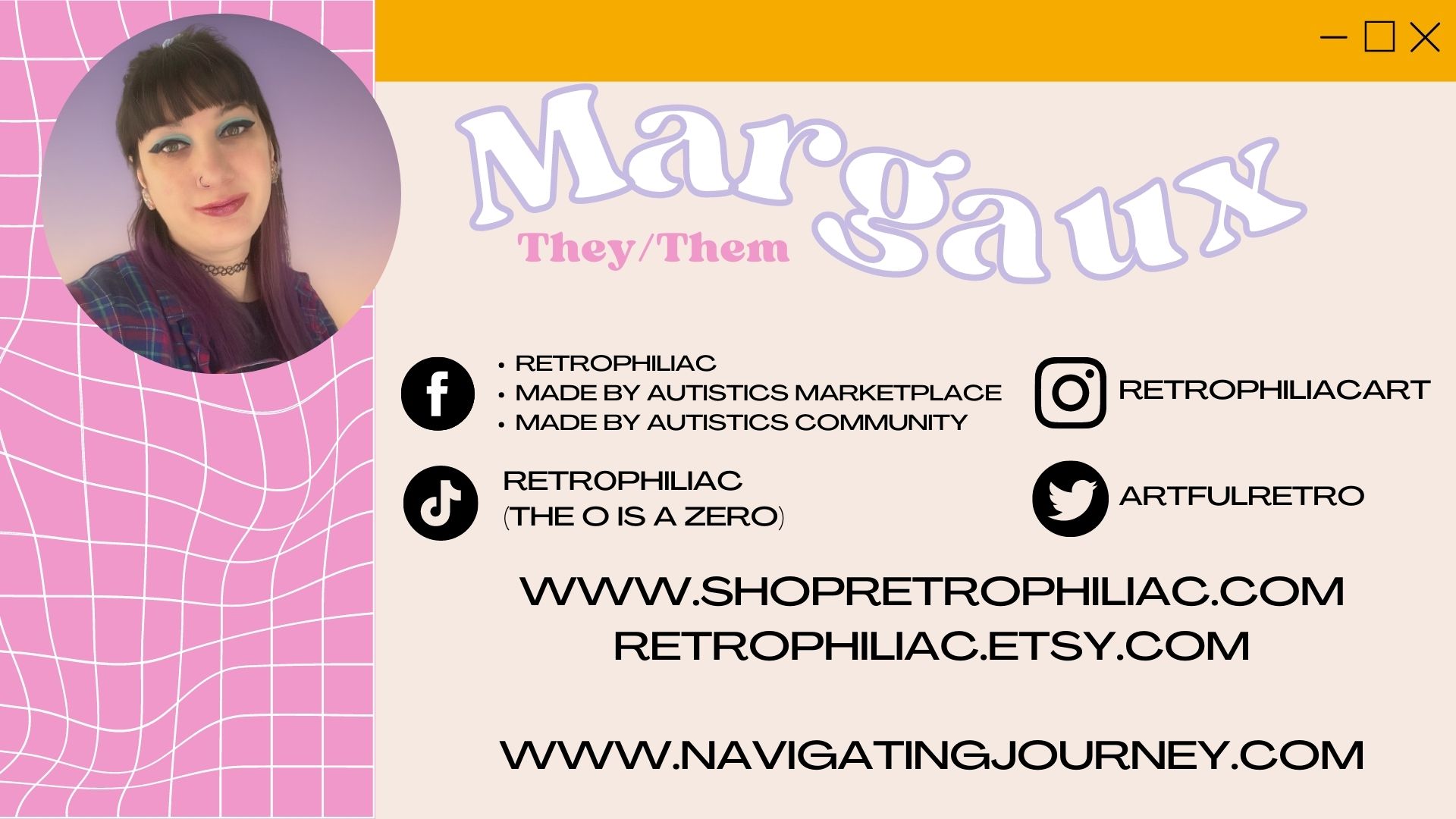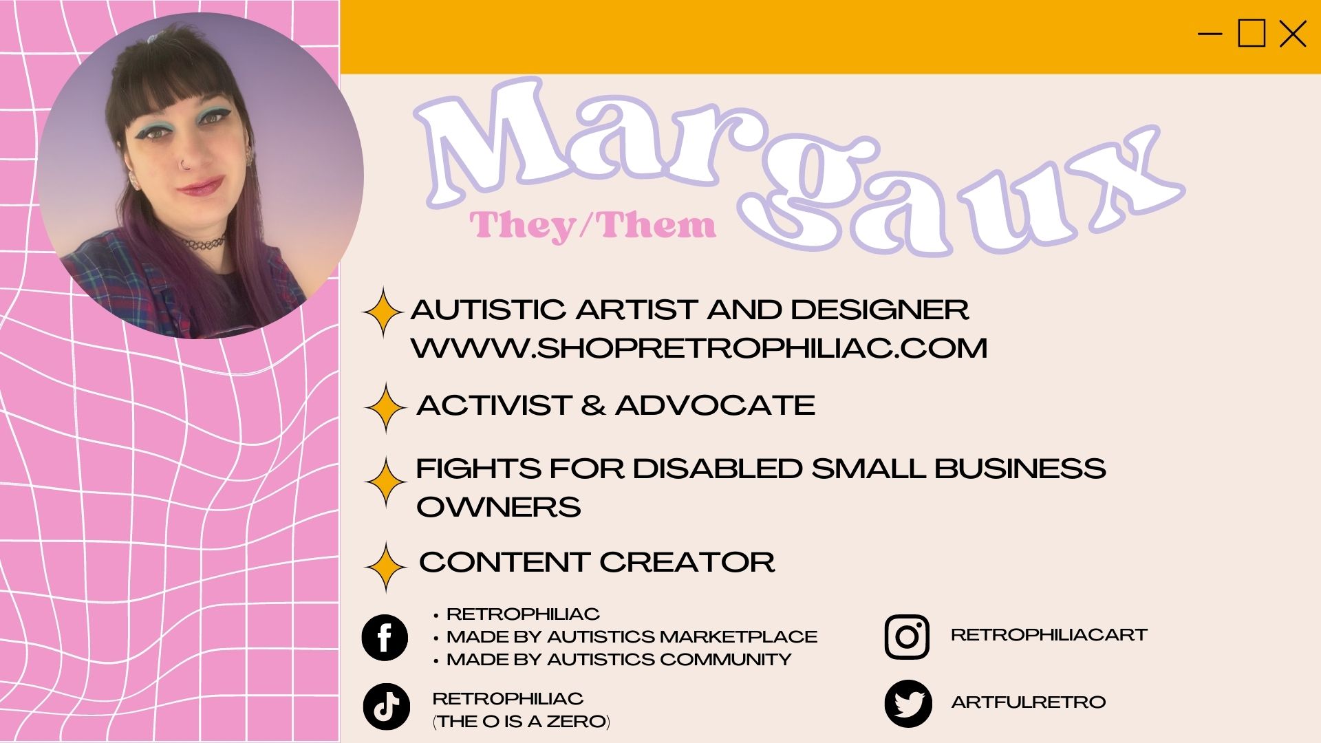 They are passionate about disability rights and fight for greater supports for disabled self-employed individuals. Margaux runs their own shop specializing in eye-catching merchandise, including neurodiversity pride items.